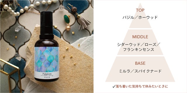 6種以上の精油を組み合わせ、香水のように奥深く、時間が経つにつれ移り変わる香りをお楽しみいただけます。