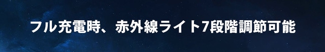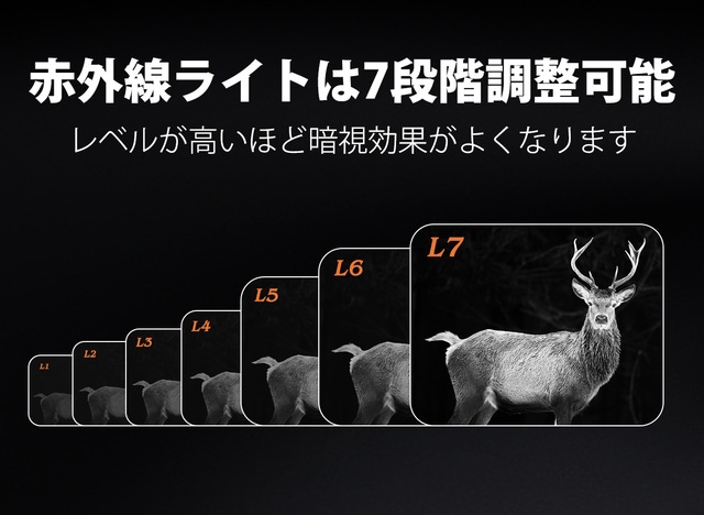 7段階の赤外線強度機能付きで、環境の明るさにより、赤外線ライトを7段階で調整することができます。(フル充電の場合に限る)レベルが高いほど暗視効果がよくなるので、ターゲットをより鮮明に観測することができます。