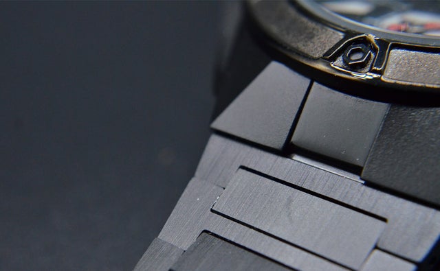 時計のエッジは、軍隊でも活用される316Lステンレス鋼を採用し、ステルス戦闘機を彷彿とさせるシルエット。