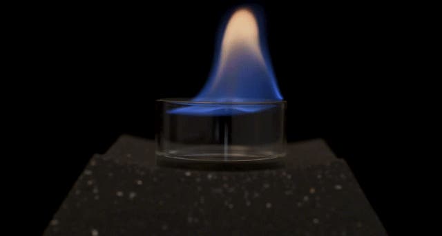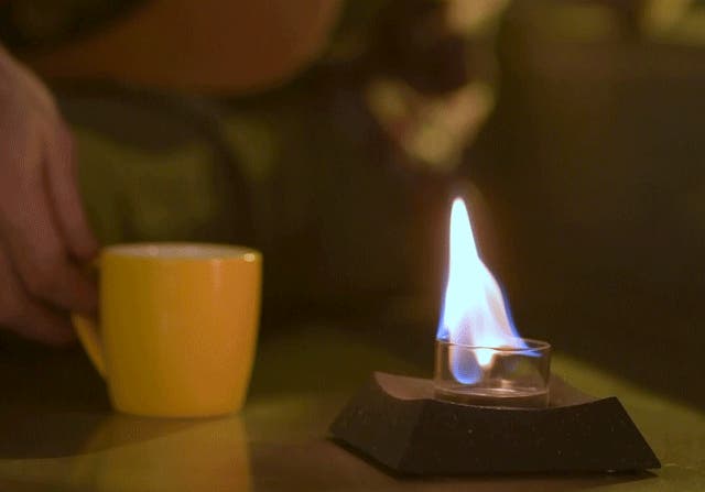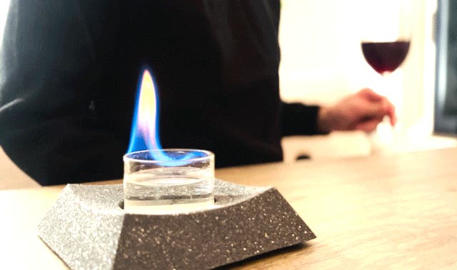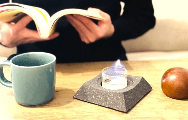 ガラスカップに燃料を注いで、マッチやライターで簡単着火。わずか10秒で点火完了!