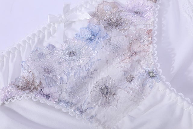 マーガレット、すみれ等をモチーフにした刺繡レ-スふんだんに使い、心躍る春の訪れを感じさせるデザイン。落ち着いた色味でモダンな美しさに仕上げました。