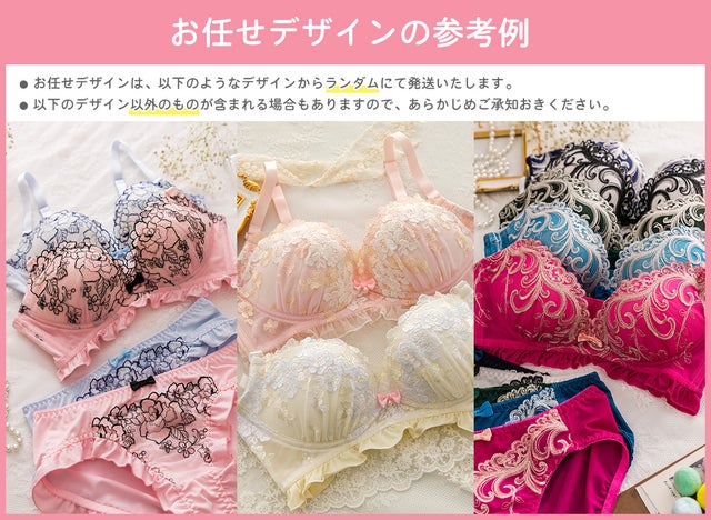 ※お任せデザインは、ご希望の色味とサイズをお選びいただけます。デザインはお選びできませんのでご注意ください。また、ショーツは透け感のあるデザイン・ショ-ツのサイズフリ-(M-L対応)が入る可能性がありますので、あらかじめご了承ください。