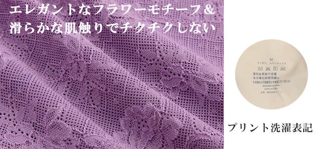 表地は優れた伸縮性のあるストレッチレースを使用、裏地は弊社のオリジナル素材「マシュマロタッチ」シ-ムレス素材を使用、エレガントなデザインとなめらかな肌触りで極上の着け心地を実現。洗濯表記はブラジャーとショ-ツ全てプリント印字仕様でチクチクしない。