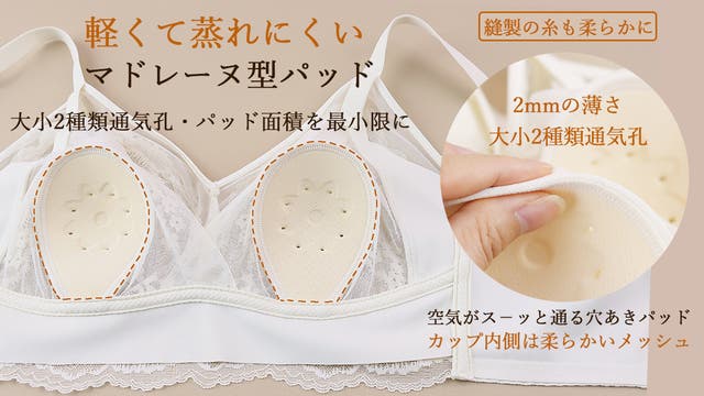 ②マドレーヌ型パッドを採用し、バストへの負担を軽減。2mmの薄さと大小2種類の通気孔で通気性良く蒸れにくく一日中快適!