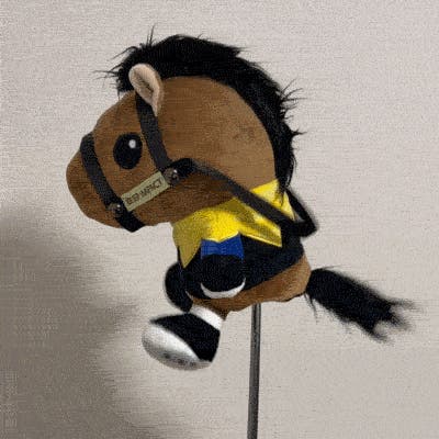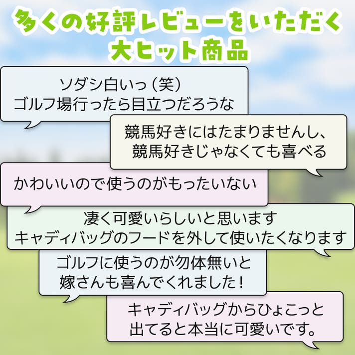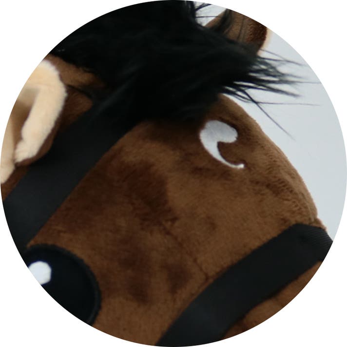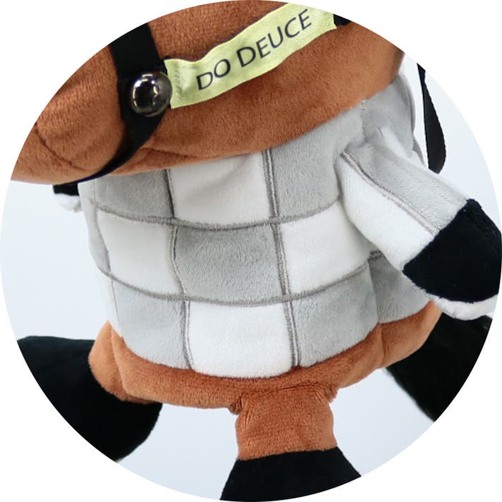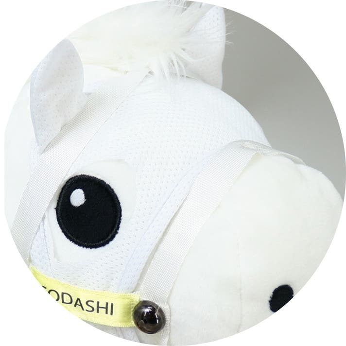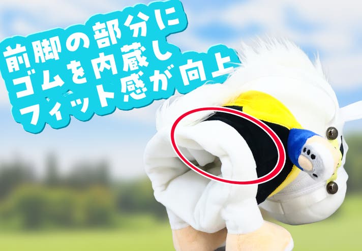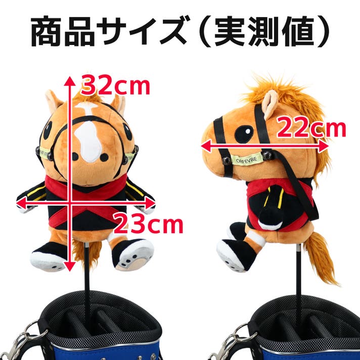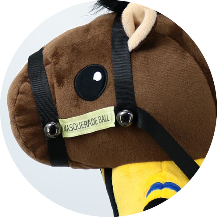 前作は馬のスリムなシェイプを表現するため合皮を採用しましたが、ぬいぐるみ型に回帰しました。お部屋に飾ってもかわいいのはもちろん、かわいらしい愛馬と共に駆けるように、広大なゴルフ場でラウンドしていただけます。