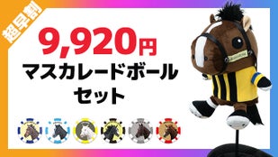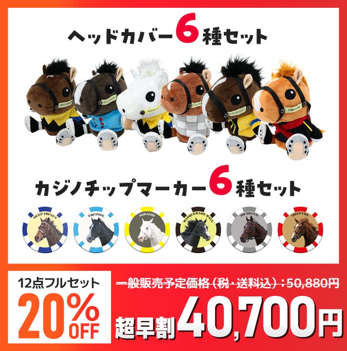 今回のラインナップである競走馬6頭すべてのヘッドカバーとカジノチップマーカーの計12点セットです。