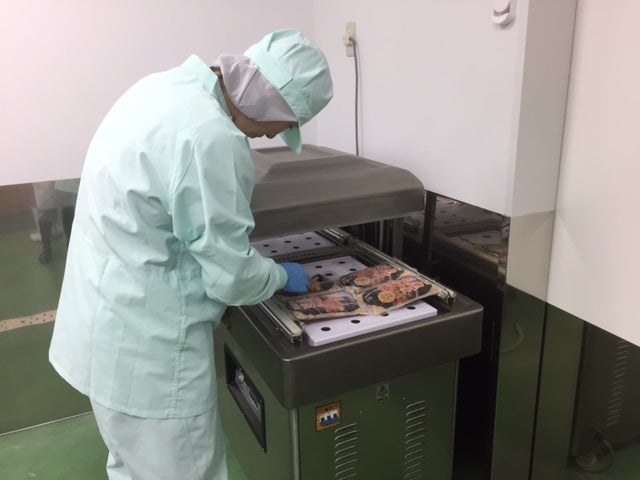 保存したもつ煮を販売用袋に手作業で詰め、真空包装し。