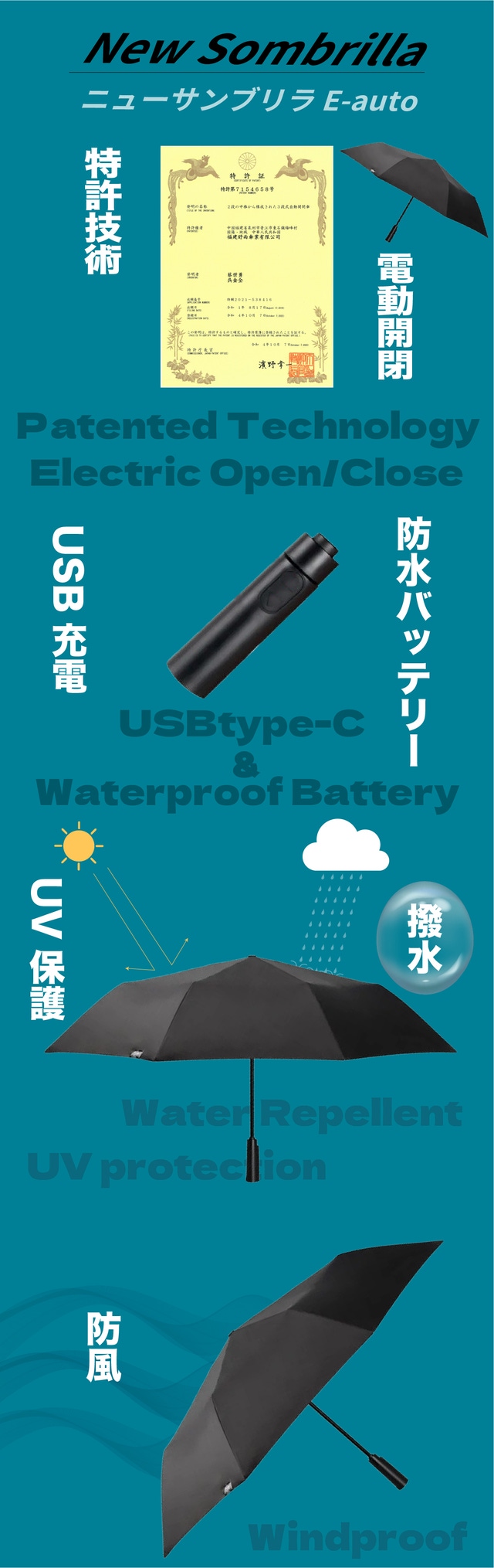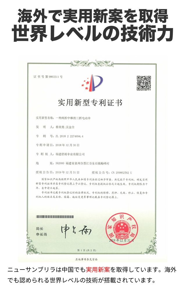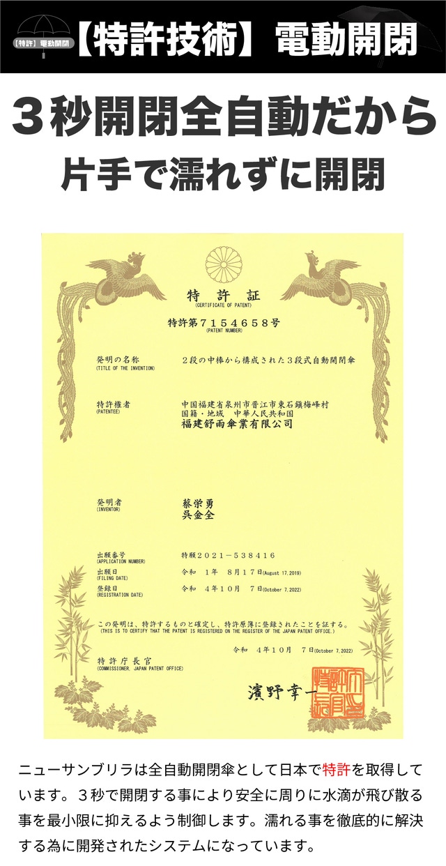 - 国内特許電動傘、片手で簡単3秒開閉で濡れを防ぐ。女性や子供、高齢者にも使いやすい