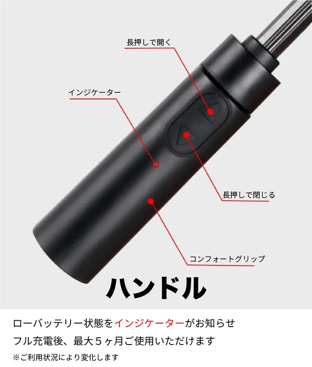 片手でラクに3秒で、中棒までワンタッチ開閉。電動&簡単操作なので非力な女性、子供、高齢の方でもご使用いただけます
