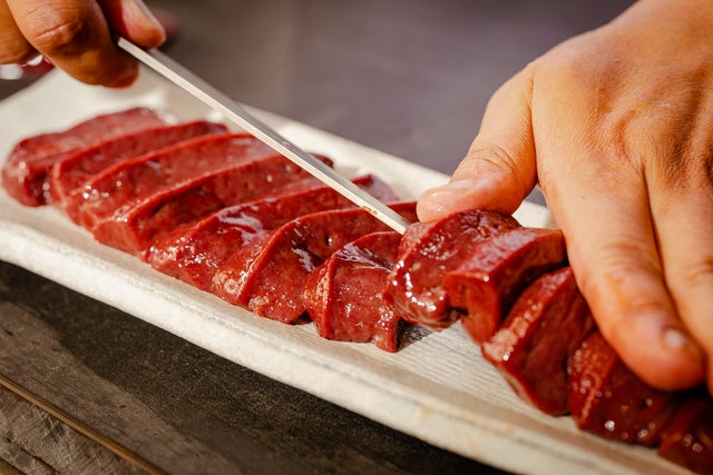 肉の部位や表情、色などによって厚みや切り口を微調整。その技は年間3000キロの和牛をさばくからこそ