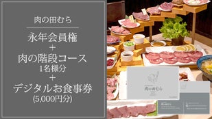 永年利用可の会員権(1~100番の会員ナンバーが印字された金属製の会員証付き。通常入会金10,000円)と7,000円の肉の階段コース1名様分に5,000円分のデジタル食事券がセットとなったリターンです。