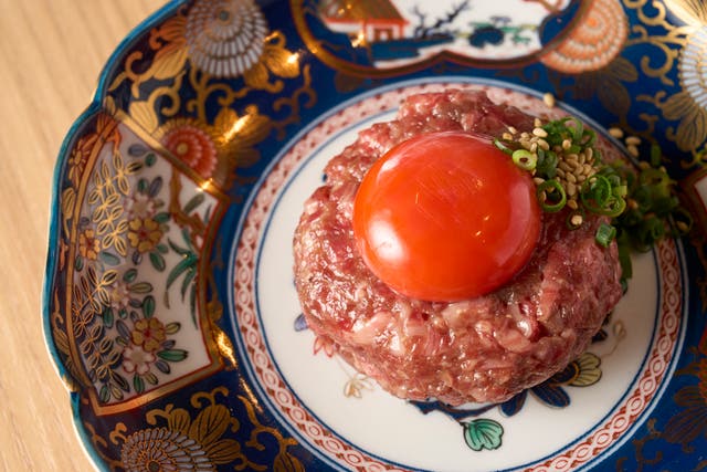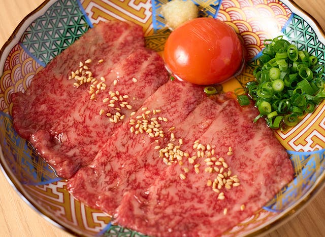 細かく刻んだ黒樺牛の厳選部位を塩味ベースで味付けし、大分県産蘭王を乗せた逸品。