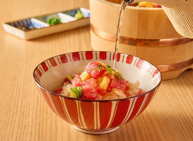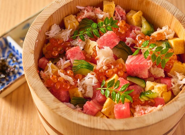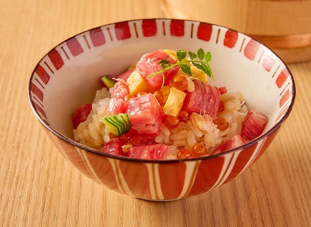 こだわりの特撰ブレンドされたご飯にローストしサイコロ状にカットした黒樺牛を乗せ、いくらやズワイガニで彩りを添えた〆のお食事。