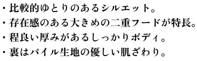 - 程よい厚みでフードは2枚生地でしっかり。 裏はパイル生地の優しい肌ざわり。