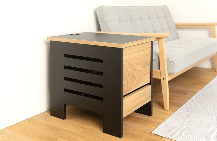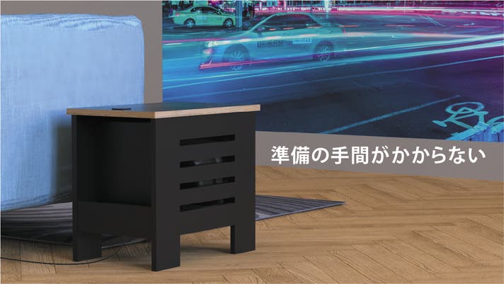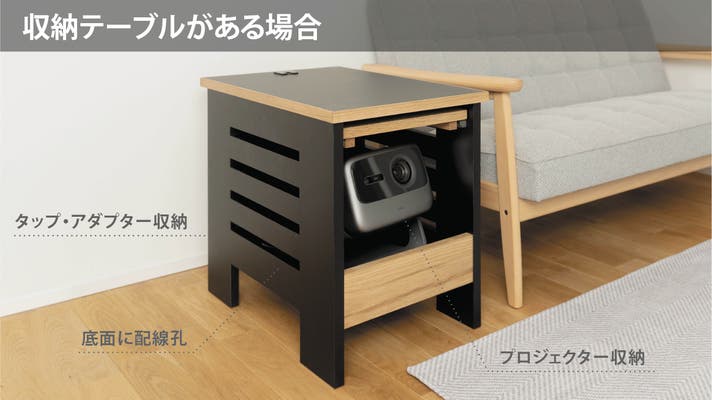 そこで開発されたのが「プロジェクター収納サイドテーブル」。プロジェクターの保護と配線整理を兼ね、置くだけで快適に使える、新しいホームシアター家具です。