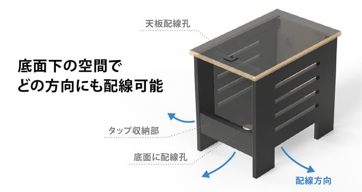 A6:内部に配線できるよう、底面に電源プラグを通せるサイズの配線孔があり、容易にケーブルを通せます。また、背面収納と天板に配線を通せる設計となっています。