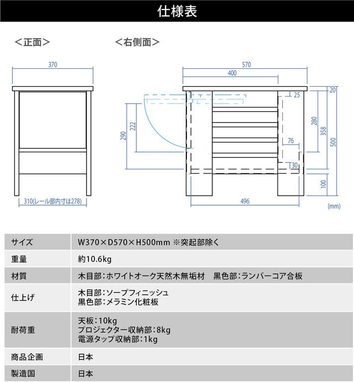 A1:内寸W310(レール部W278)×D400×H290mmの収納部内で投影可能な向きに調整できるプロジェクターに対応します。