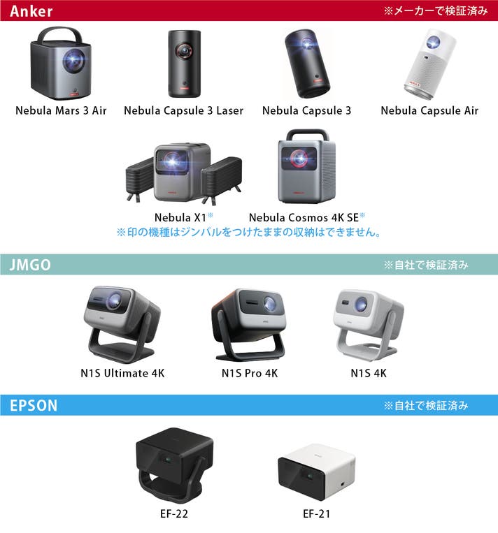下記のプロジェクターは収納したまま映写ができることを確認しています。