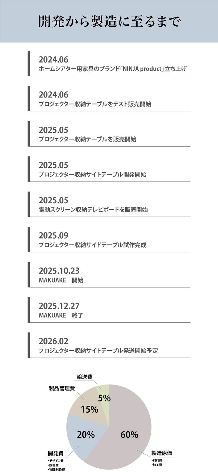 - 工事不要で設置でき、プロジェクターを保護しながら手軽に使用できる「収納家具」の必要性を感じた