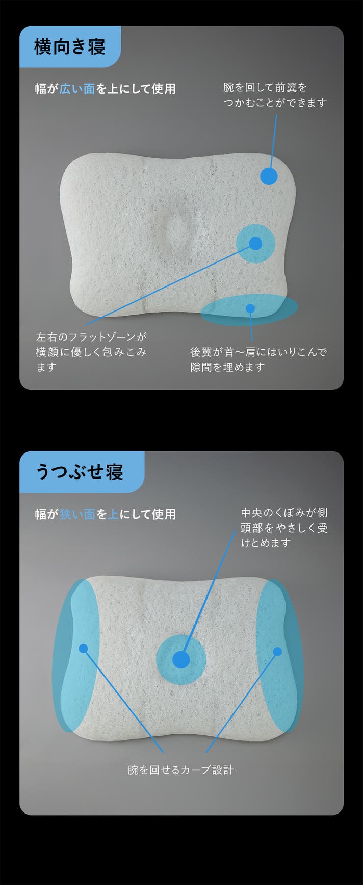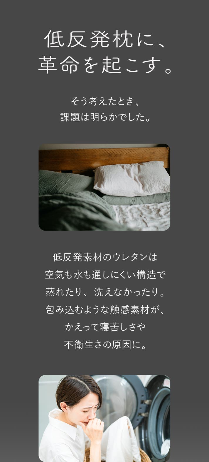 本製品は、頭や首をやさしく包み込みながら、蒸れにくく快適な寝心地を目指して設計されたピローです。一般的な低反発枕の課題であった「蒸れ」「洗えない」といった悩みに配慮しています。