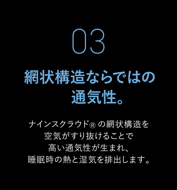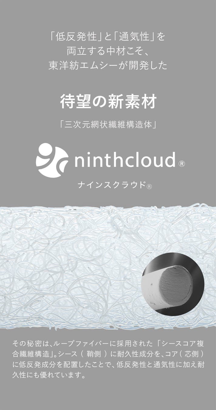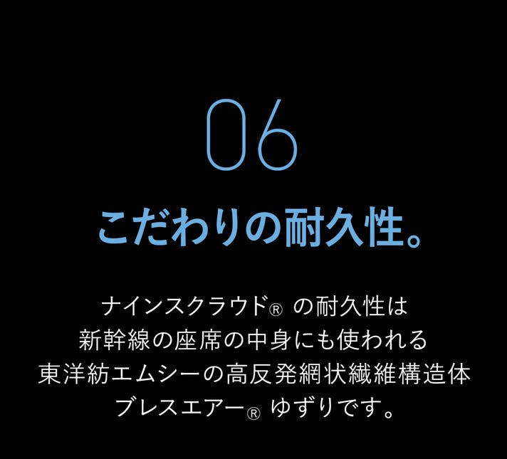 「ナインスクラウド®」は、当社が長年「ブレスエアー®」の開発で培った技術を基盤に、新たに開発した低反発性と高い通気性を両立した三次元網状繊維構造体です。ブランド名は、英語で“至福の状態”を意味する「Cloud Nine」に由来しており、お使いいただく方に快適さと幸福感を届けたいという想いを込めて名付けました。
