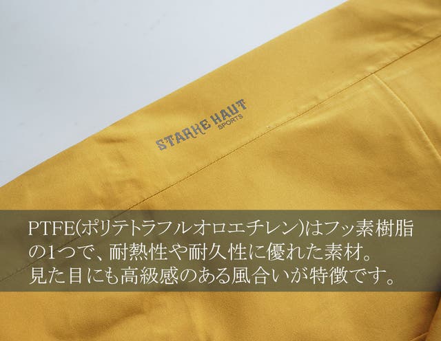 一般的な防水パーカーで使用されている素材はPTFEですが、今回のマウンテンパーカーでは、特別なフッ素樹原料で加工を施した“PTFE-WP”というハイテク素材を採用。