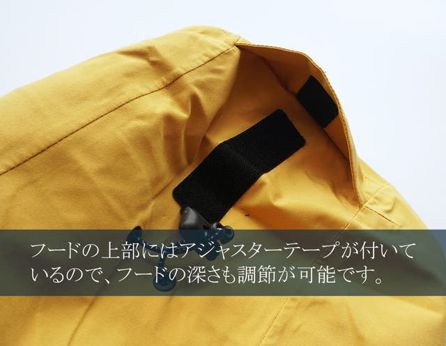フードの形状を調節することでしっかりと頭部をホールドできるので、強い風が吹いてもフードが脱げにくく、雨からも守ってくれます。