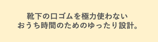 足にはきちんと留まるようにしながらも、締め付けすぎない、おうち時間にフィットするデザイン設計を施しました。ずれたりして不快にならないように、最低限のゴムは使用していますので、部屋での移動時も安心です。