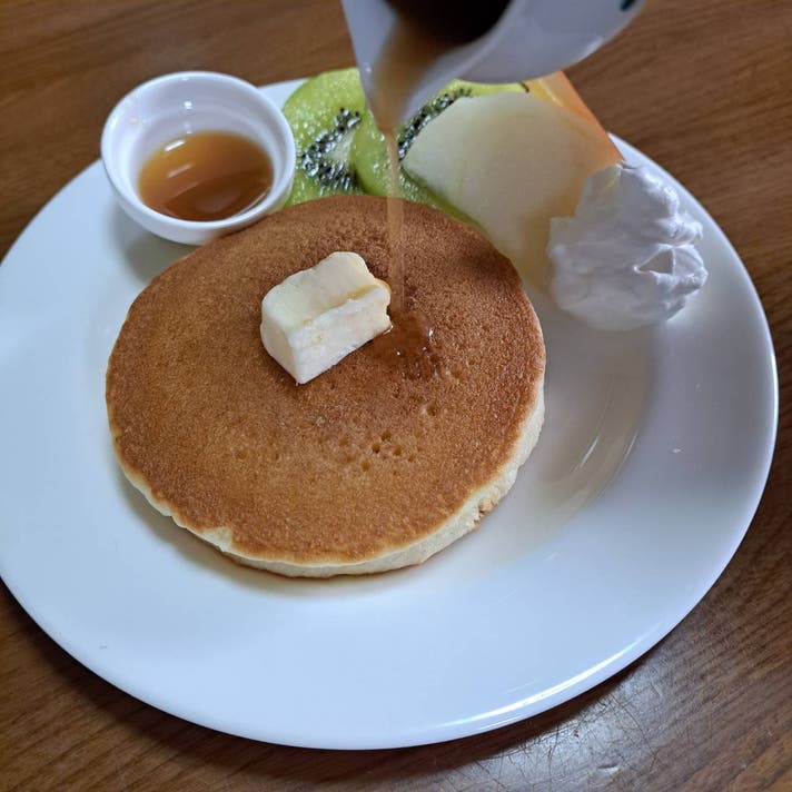 概要:パンケーキにシロップをかけた、家族が喜ぶおやつ。