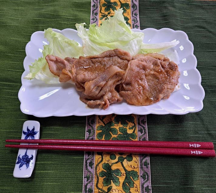 材料(2人分):豚ロース薄切り200g、シロップ大さじ1、醤油大さじ1、みりん大さじ1、サラダ油小さじ1、(付け合わせ)キャベツ千切り100g。