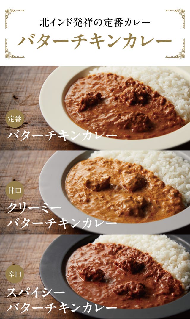 マイルドだけではない味わいをぜひ日本でも楽しんでいただきたいという思いにかられ、今回3種類のバターチキンカレーをご用意しました。
