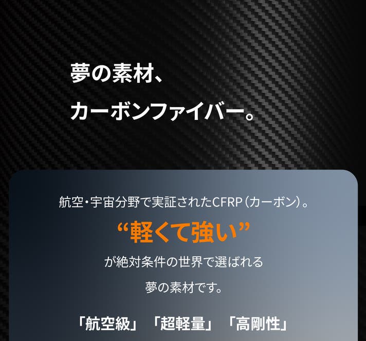 そこで私たちが選んだのが、航空宇宙や先端分野でも採用される**カーボンファイバー(CFRP)**でした。