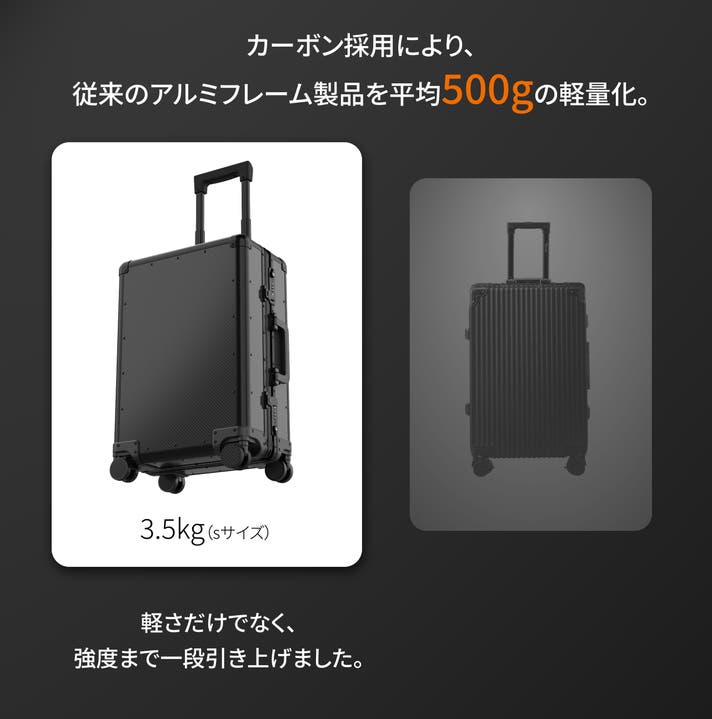 従来のアルミ合金フレームスーツケースと比べて平均500gの軽量化を実現。