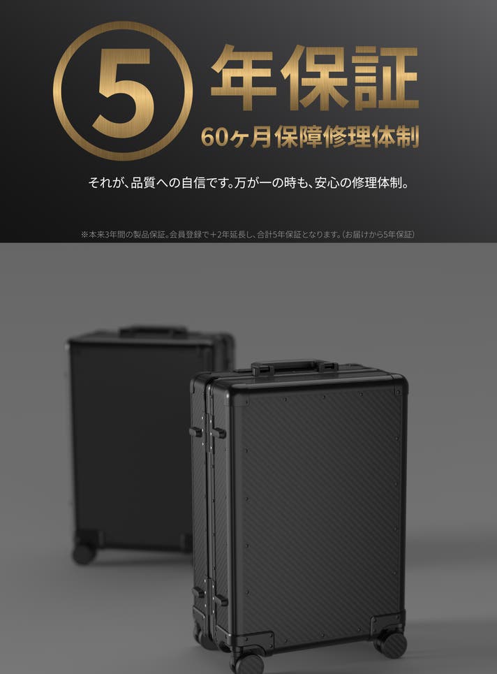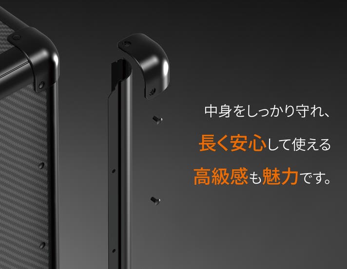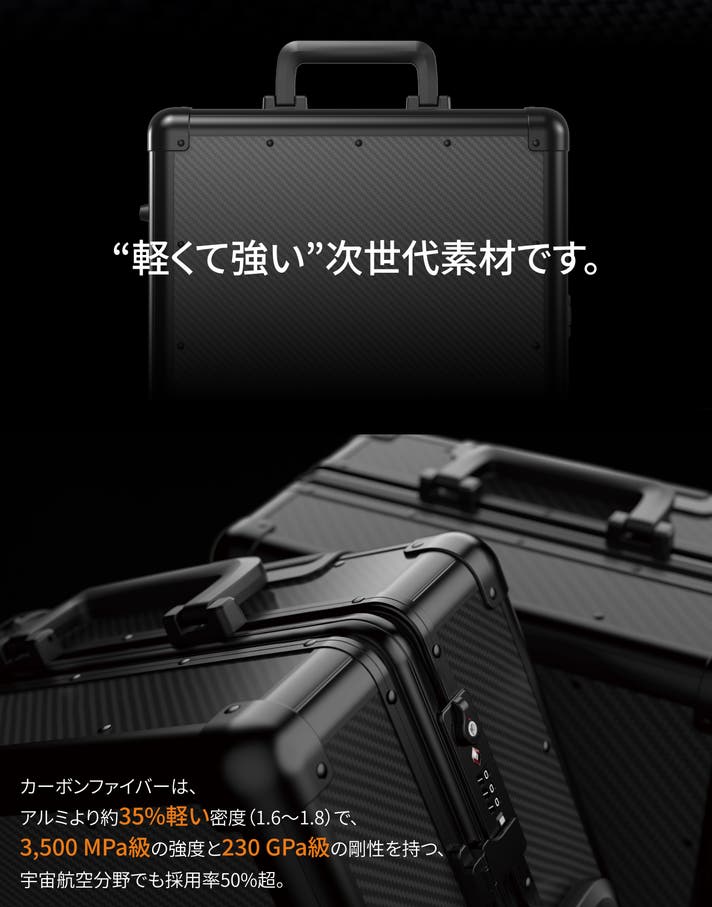 カーボンファイバーは金属に比べて圧倒的に軽く、しかも高い剛性と耐衝撃性を備える夢の素材です。その軽さをボディに、そしてフレーム式の信頼性をアルミ合金骨格に担わせることで、従来の自社アルミ合金フレームスーツケース比平均1kgの軽量化を実現しながら、全体強度も一段引き上げました。