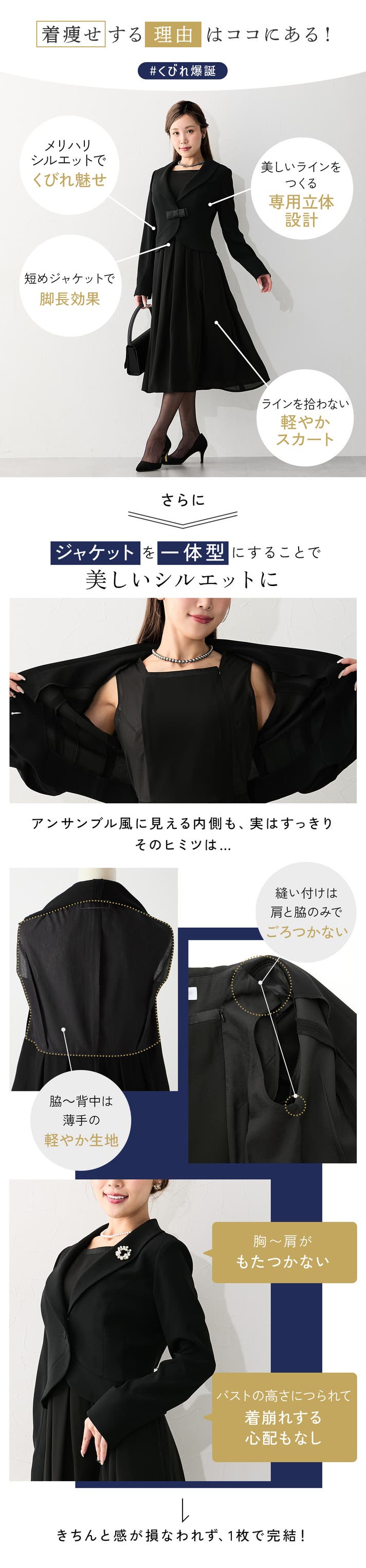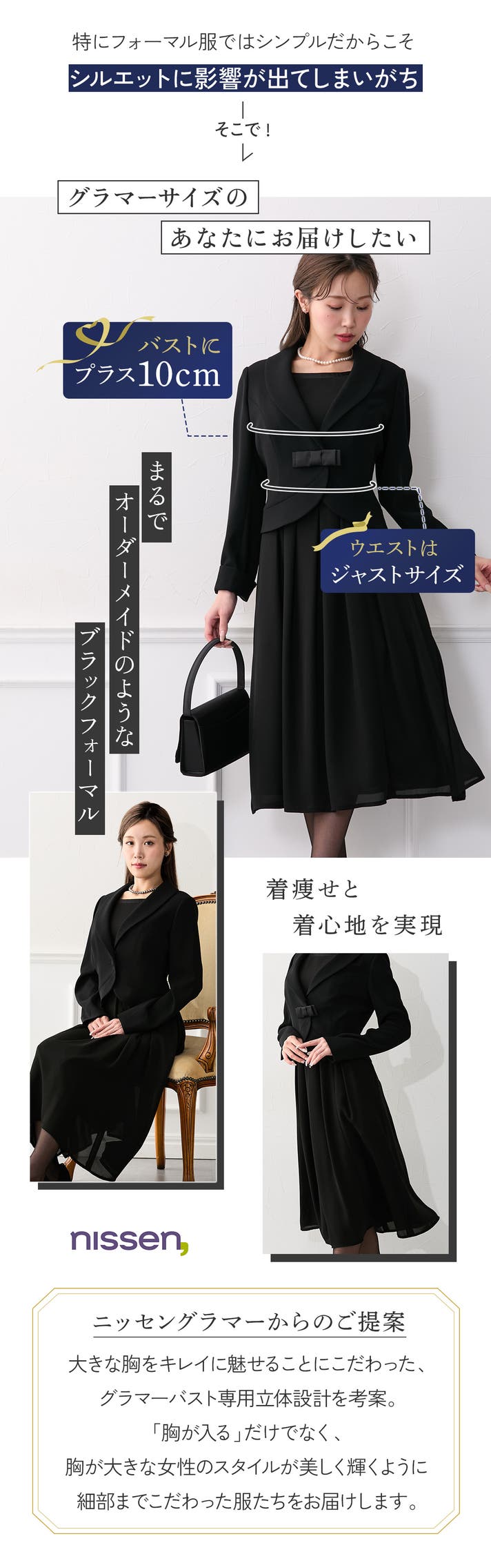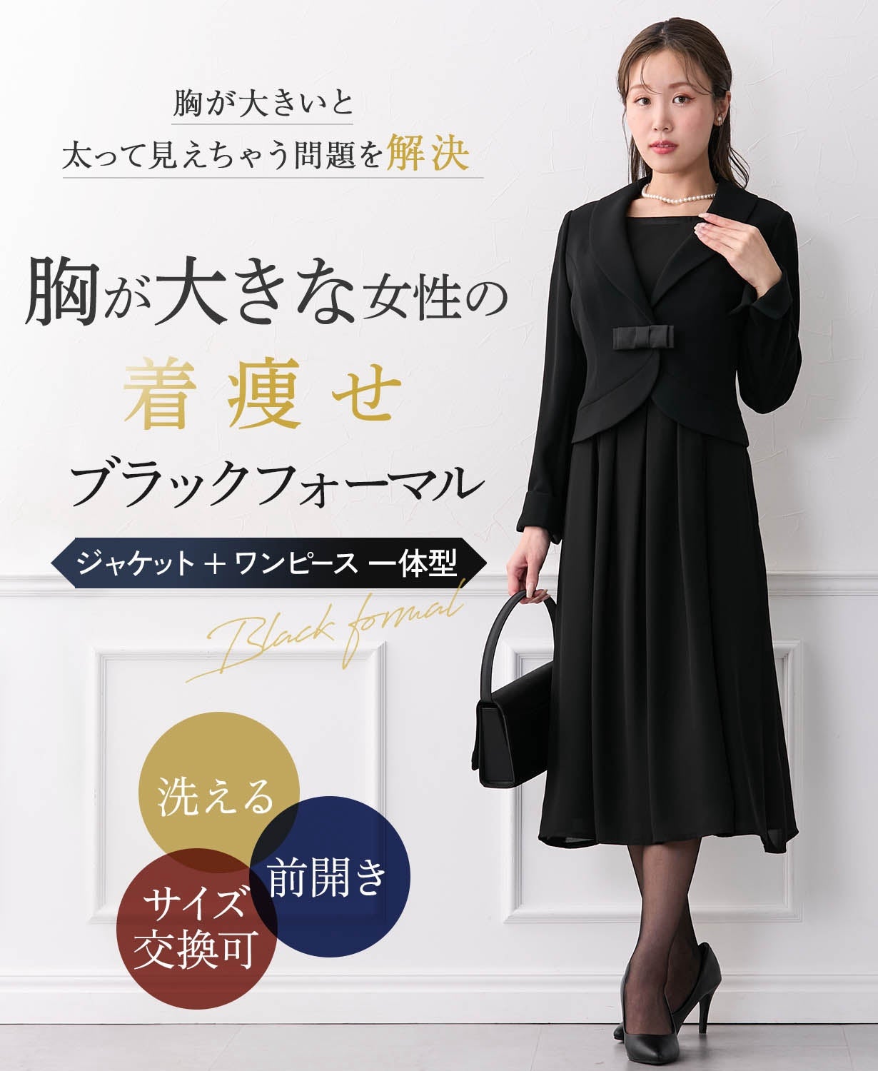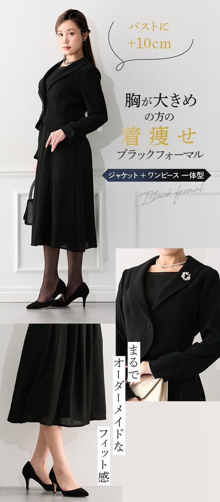 - 大きい胸がきちんと収まり、着痩せと美しいシルエットが叶うブラックフォーマルワンピース。