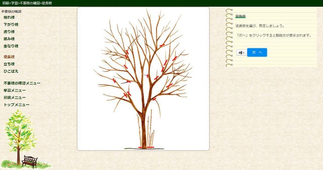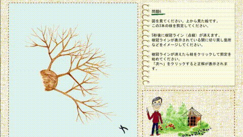 - 実践が難しい剪定練習も画面上で枝を切る練習ができ、ゲーム感覚で楽しく剪定の基本が身につきます