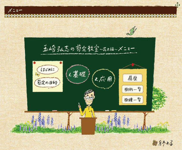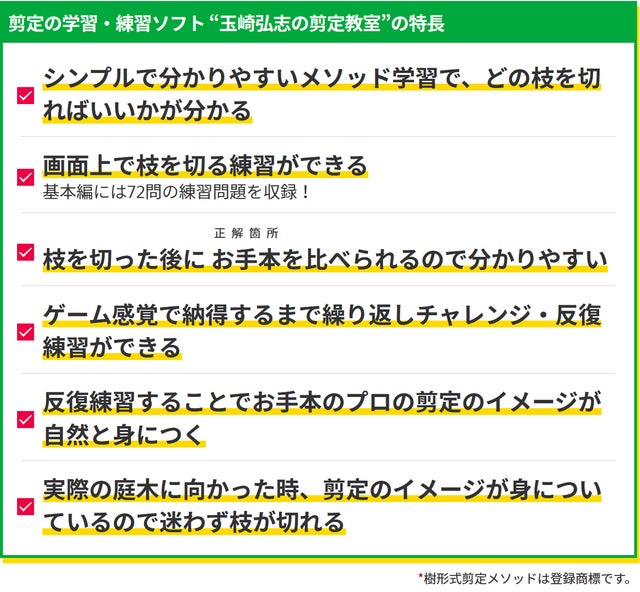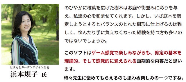 私たちの仲間の中に、NHK趣味の園芸の人気講師でトップガーデナーだった故玉崎弘志先生がいらっしゃいました。玉崎先生のアドバイスをいただきながら「樹形式剪定メソッド」をベースに開発したのが、パソコン用剪定の学習・練習ソフト「玉崎弘志の剪定教室」です。このソフトで、一人でも多くの人が剪定上手になって、庭木がいつもきれいで素敵なおうちがいっぱい増えるとうれしいです。
