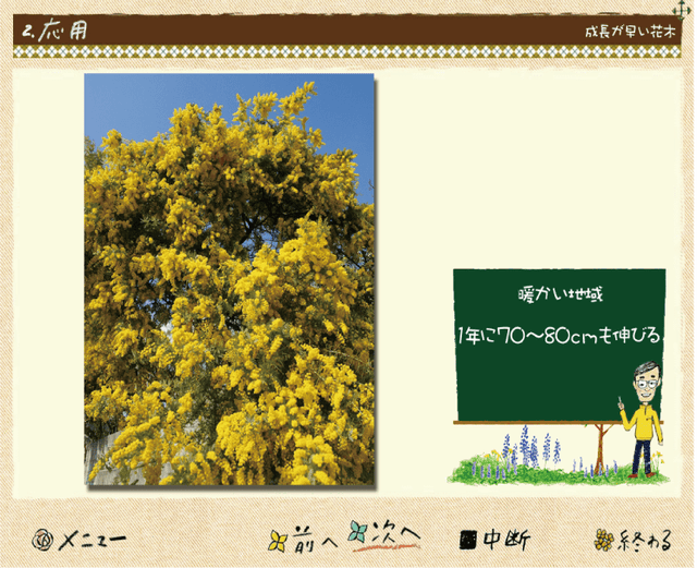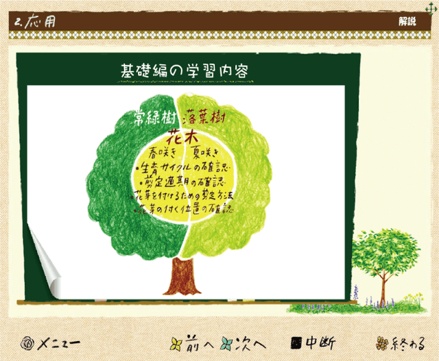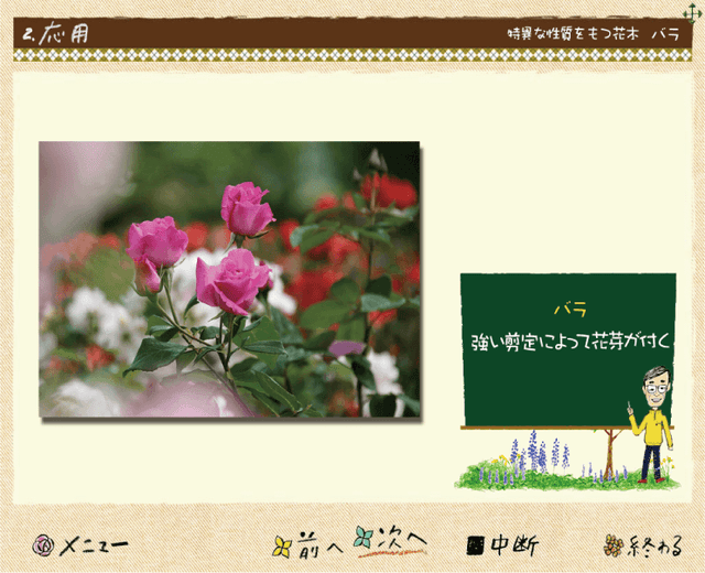 これから学習する「花木」とはどんな樹木か?や、このソフトで学ぶ目的、花木剪定の重要なポイントについて解説しています。