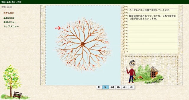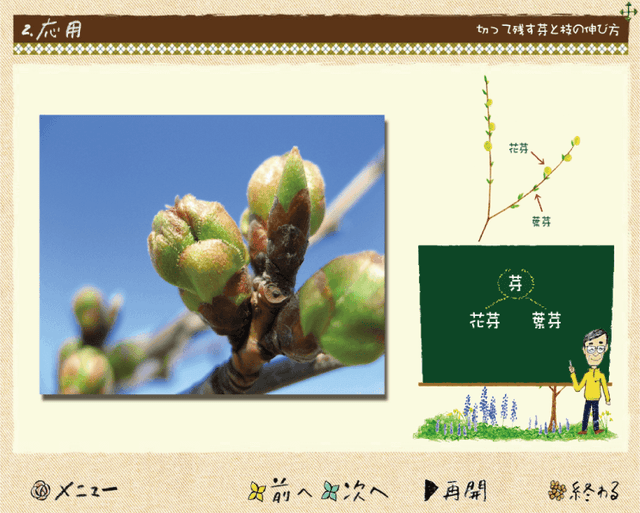 ゲーム感覚の剪定シミュレーションで、何回でも練習が可能。 このソフトで繰り返し剪定を練習することで、「樹形と大きさのコントロールするための剪定」「花芽を付けるための剪定」「健康に育てるための補助手段としての剪定」を身につけることができます。