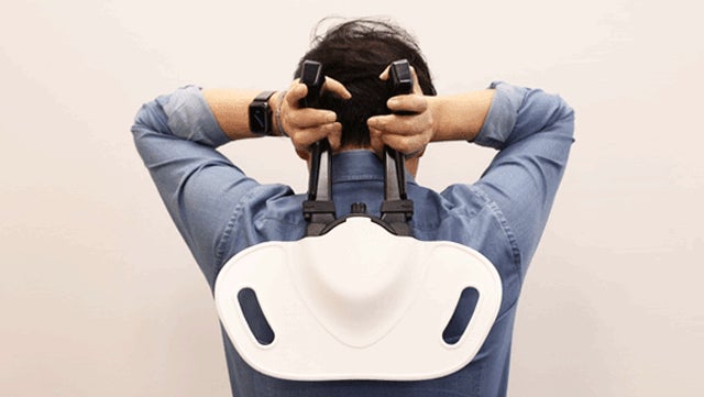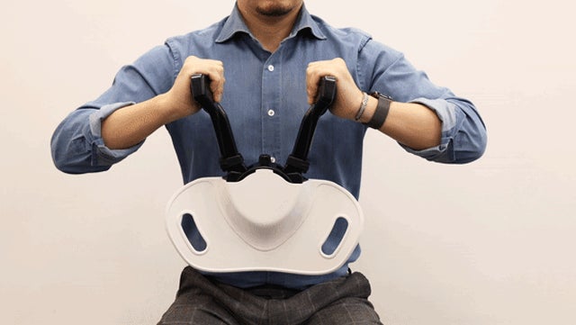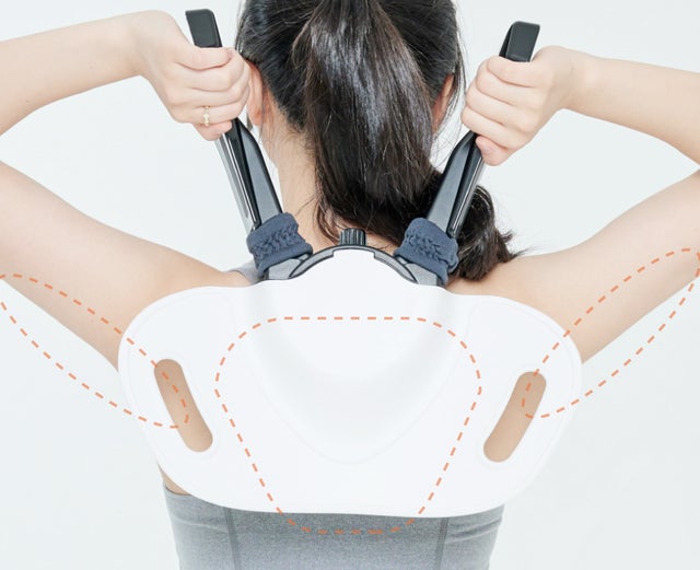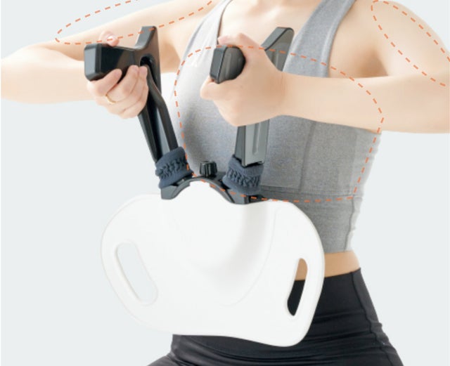 本体を胸の方に持ってきて本体の足を両手で握ってください。息を吸って腰をまっすぐに立てます。ゆっくりと締めたり、緩めることを10回3セットを繰り返します。