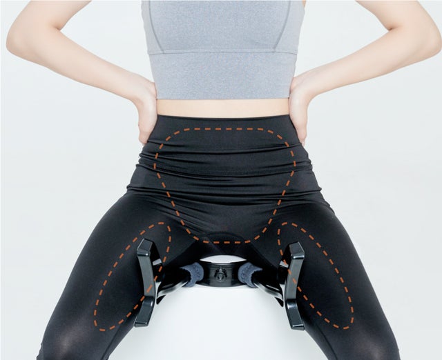 本体の取っ手を両手で持ち、45度の角度でお腹の方に付けた後、本体の足を膝の間に入れて『3秒間ずつ、締めて緩める』といった動作を5分間繰り返してください。