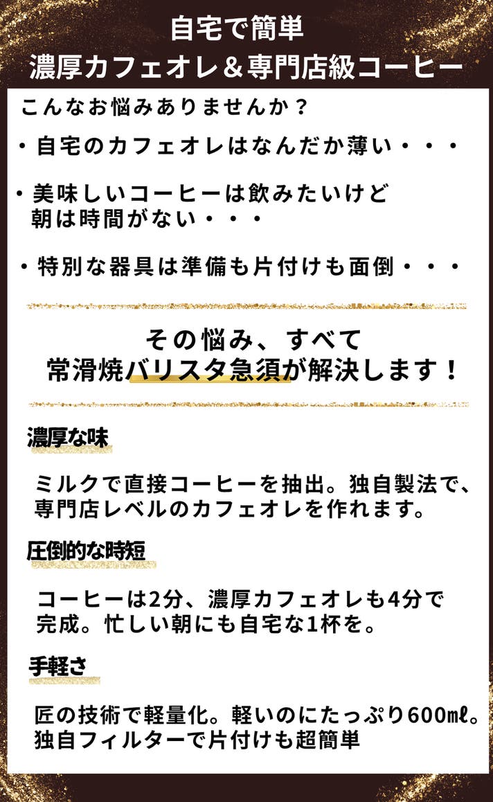 このバリスタ急須はコーヒーやカフェラテだけではなくミルクの旨味をいかす飲み物をお楽しみいただけます。