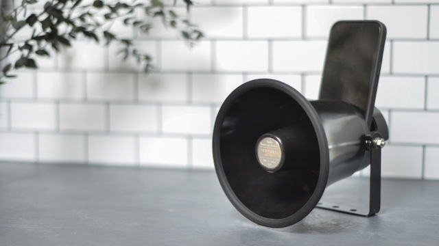 スマホを音源とすることで、拡声器が電源をとらずに手軽に使えるスピーカーへと生まれ変わりました。