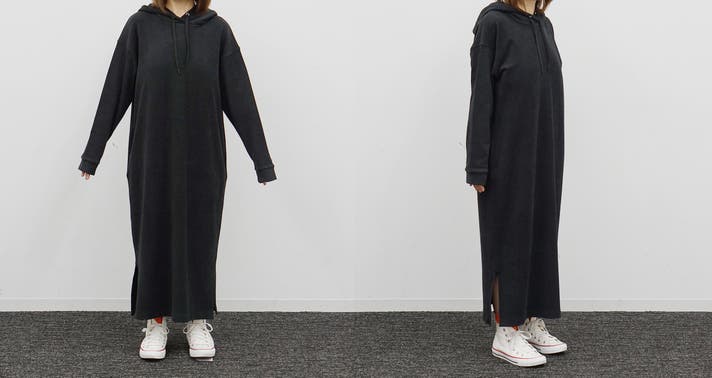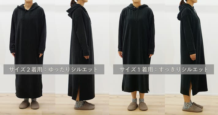 「私は身長160cmの普通体型です。両方のサイズとも着られる身長ですが、ユルっと着たい場合には、「サイズ2」が良さそうで、「サイズ1」は少しすっきりしたシルエットになります。」