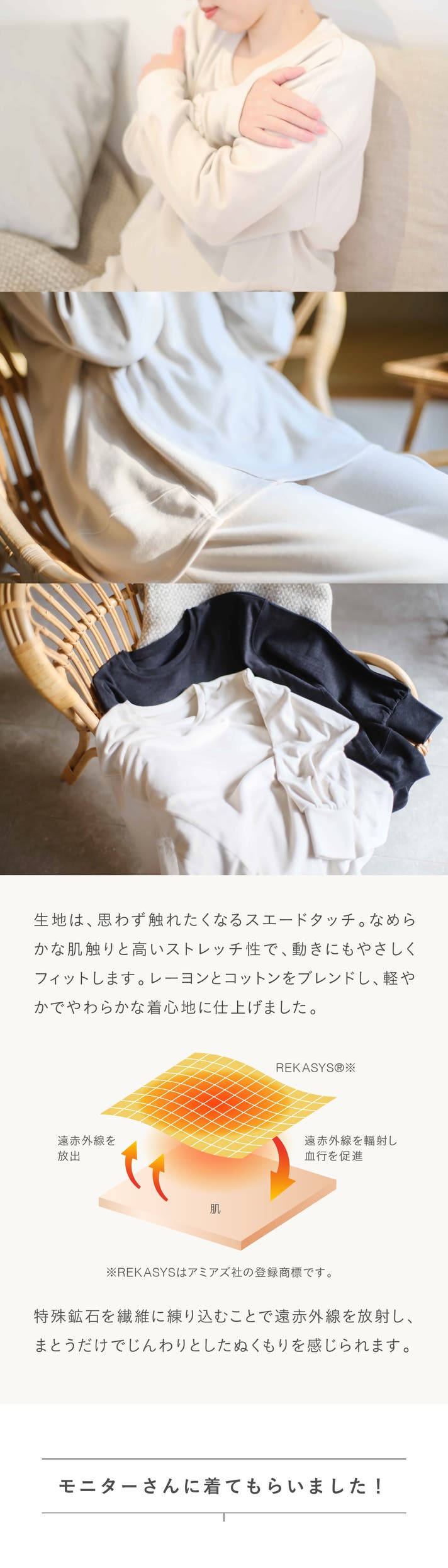 スエードタッチでもっちり柔らかい肌ざわりで、着た瞬間からふんわり気持ちいいです。no-buのブラレスリカバリーは、動きやすくて締めつけもなく、ヨガのレッスン後や瞑想の時間にもぴったり。