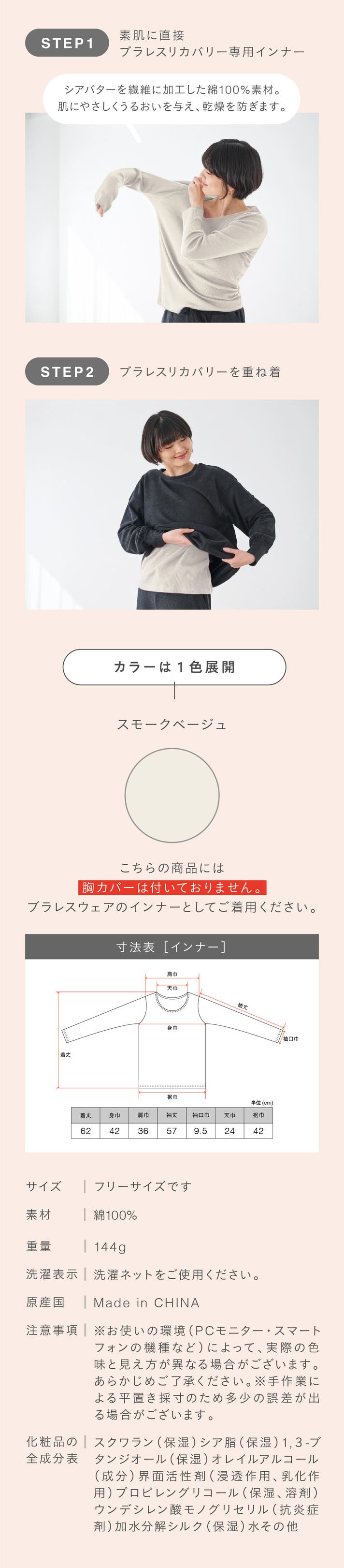 専用インナーは、敏感肌の私にとって、直接肌に触れる部分が化繊ではないのは本当に嬉しいです。シアバター加工なのも嬉しいですね!綿100%のインナーを重ねて、あたたかく過ごせるのが気に入っています。