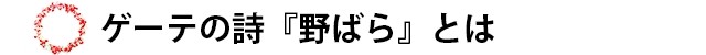 そんな歴史的人物として偉大なゲーテも若かりし頃に旅をし、ある旅先の村で一人の可愛らしい女の子に出会い一目惚れをします。 女の子もゲーテとの恋に落ち二人は恋仲になるのですが、 彼は自身の文学活動などのために別れを告げ村を後にします。 しかし、自分で振っておきながら女の子のことが忘れられず、長い間想いを馳せる…。 そんなゲーテ自身の恋愛体験から、『野ばら』は生まれました。