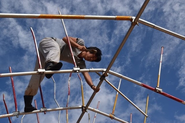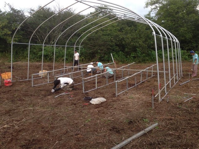 そこに農業用ビニールハウスでステージの枠組みを手作りで作りました。