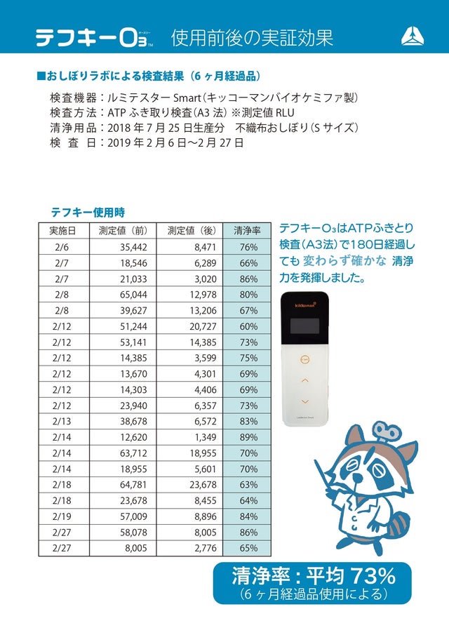 こちらの試験で使用した製品は製造から6カ月を経過した製品で行いました。通常のオシボリは製造から3カ月が使用期限の目安です。それ以上たつとオシボリが乾燥してしまうからです。私たちのこの製品長期保存も可能と言う特徴も持ちます。