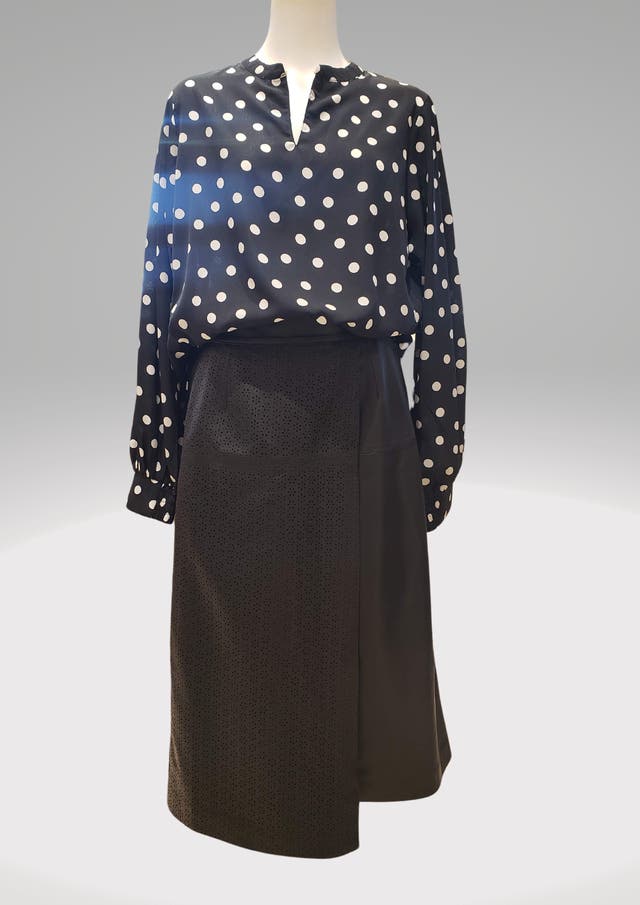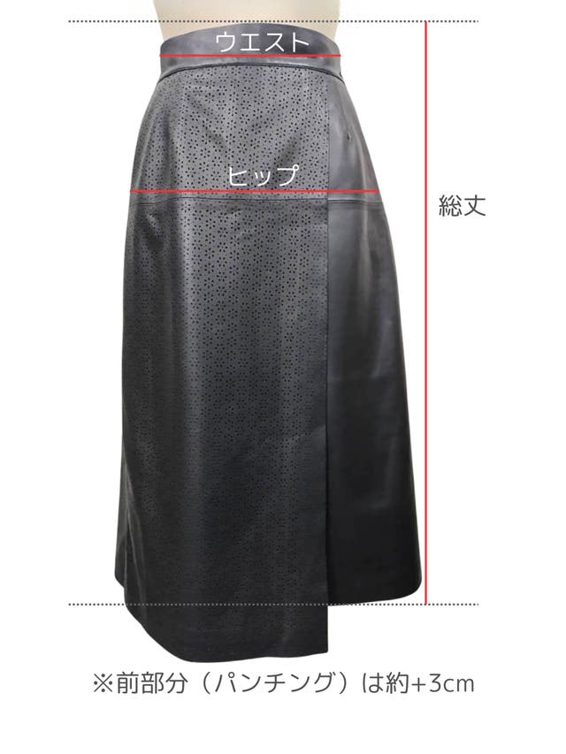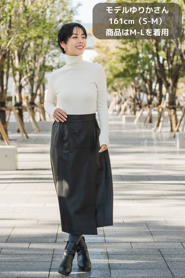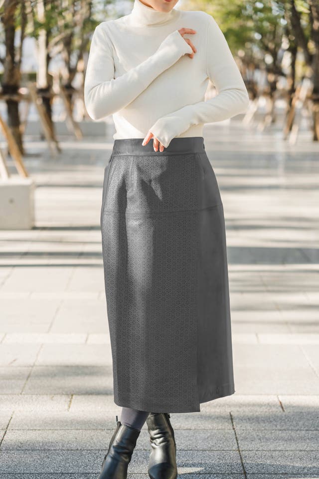 ③レザーの巻きスカート風ロングスカートは皮革の分量がたっぷりなのにとても軽い